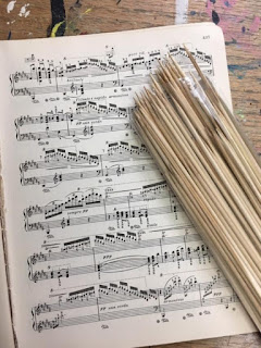 The skewers are just from the grocery store. I get asked where to find vintage sheet music books: go to the thrift stores and look through the books until you get to the music section. There's always something there you can use, even trumpet music! If it's not "vintage" in color, and you want that instead of a crisp white just "paint" it with coffee or tea and let dry! Worse case is to search the internet for "vintage sheet music images" and print out a few pages.